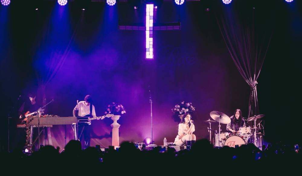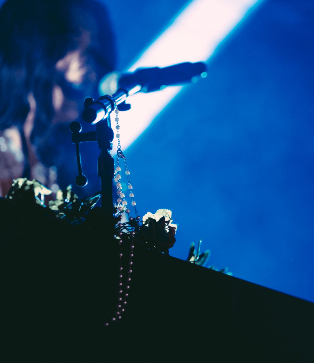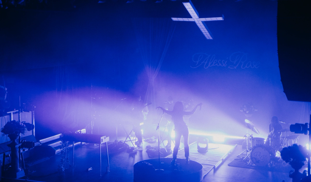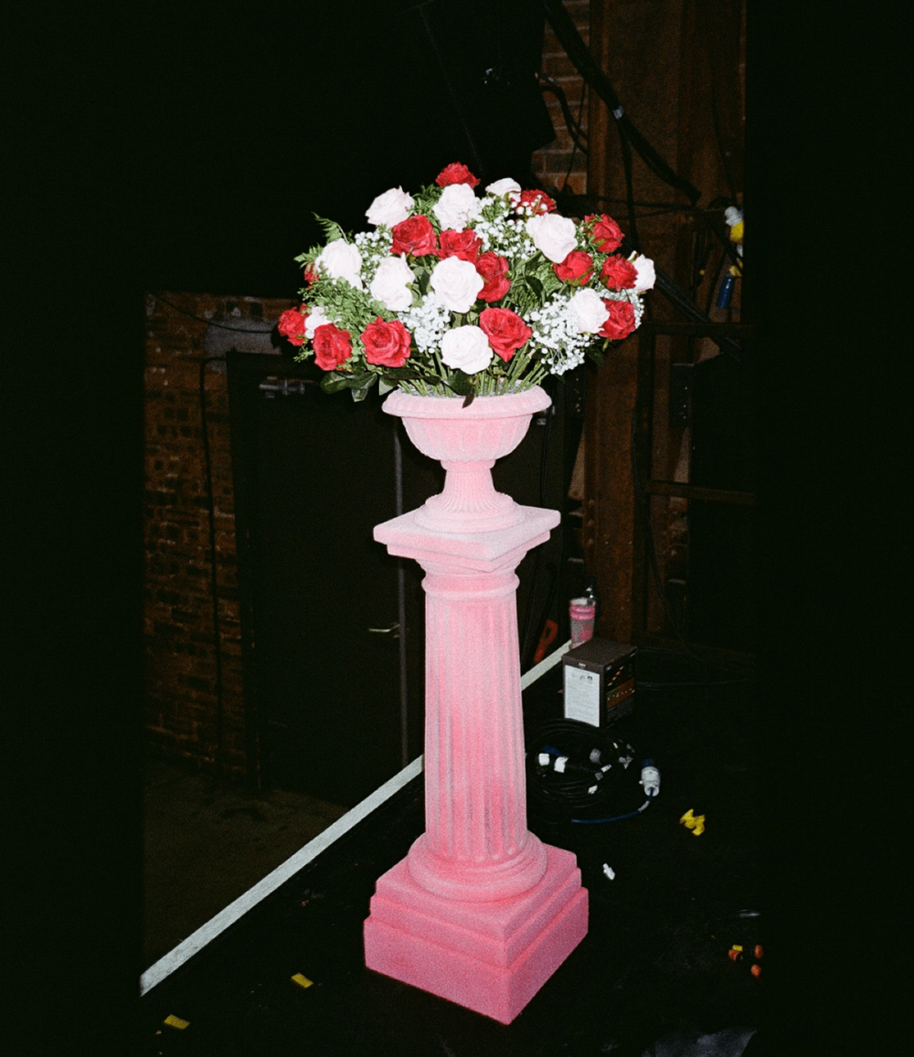 For Alessi’s show, we conviene inside of the chapel, donned in a pink carpet aisle running centrally down the stage with a round end, flanked by neon lighting elements and accentuated by floral columns. Alessi and the band will be adorned in light from a modular bespoke softbox in the shape of a cross overhead.