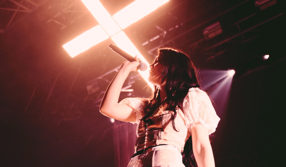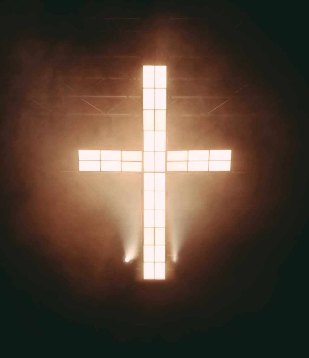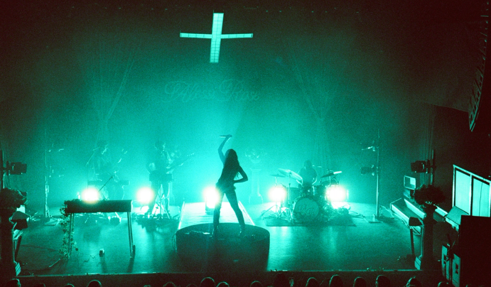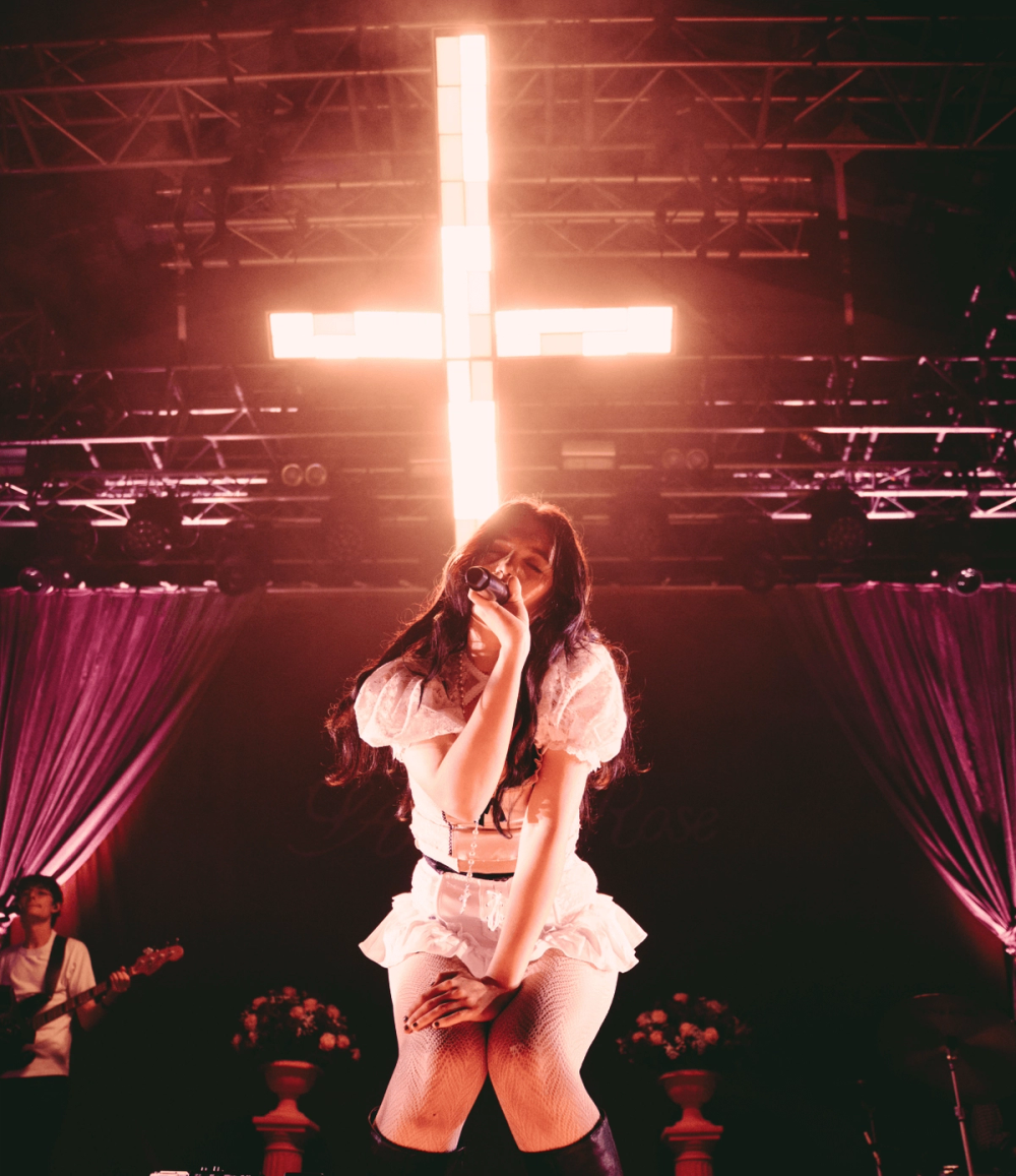 For Alessi’s show, we conviene inside of the chapel, donned in a pink carpet aisle running centrally down the stage with a round end, flanked by neon lighting elements and accentuated by floral columns. Alessi and the band will be adorned in light from a modular bespoke softbox in the shape of a cross overhead.