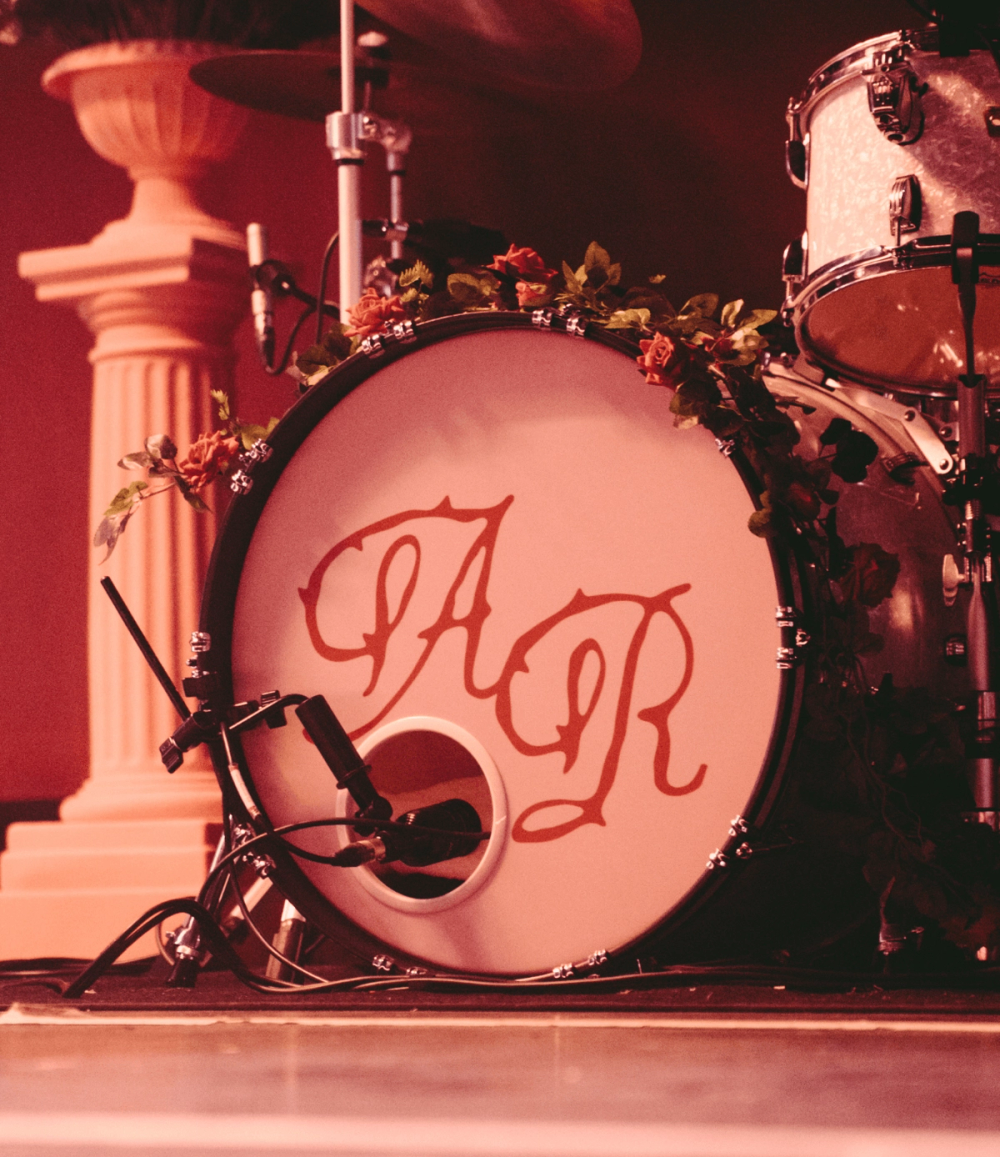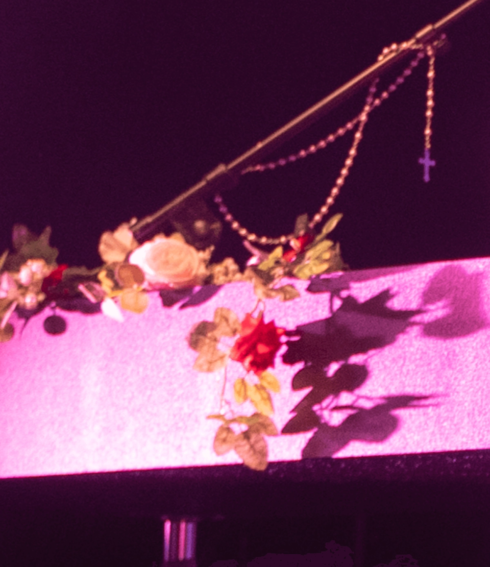 Beauty is in the details, with custom-made rosary curtain ties, pink and red rose vines, and “AR” drum decal.