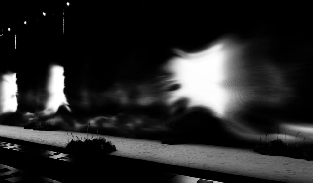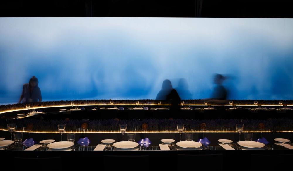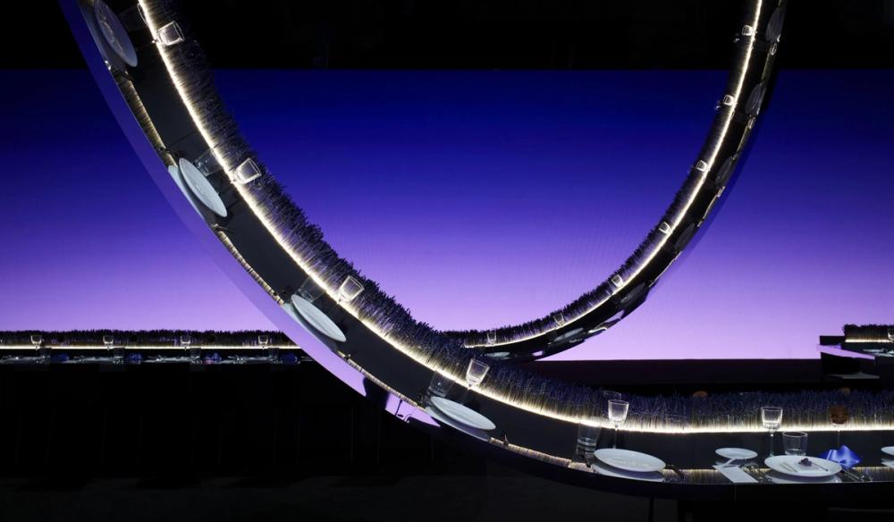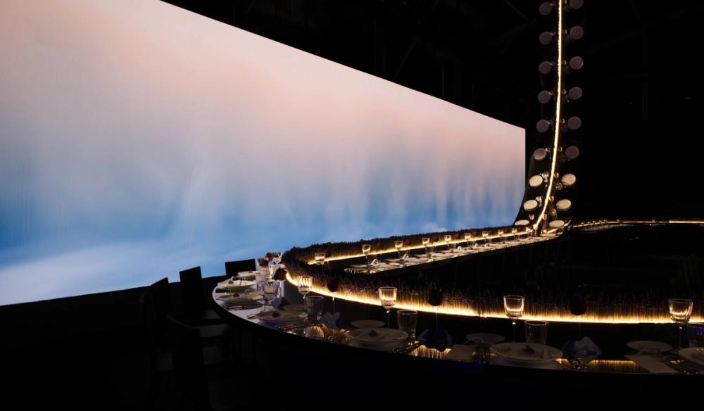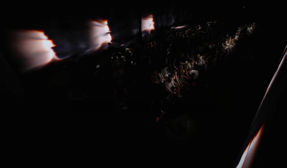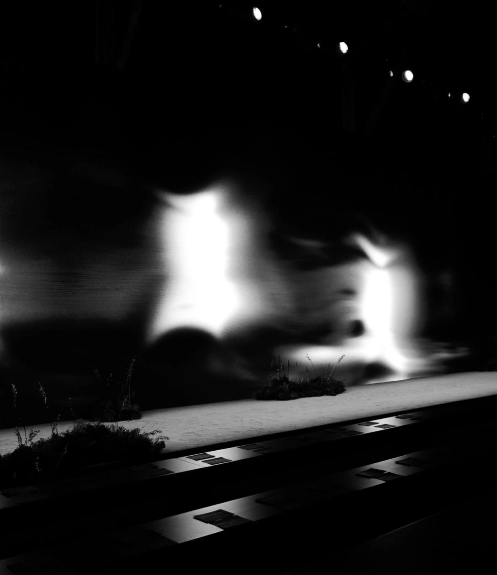 The screen content works in conjunction with the lighting to provide a evolving backdrop to the show. To create the content we directed and filmed a series of model walks which were heavily affected, using a combination of real time and AI processes, turning the characters into abstract and ethereal light trails. The ethereal forms pass across the screen seeking and searching for each other as more and more characters start to fill the digital space.