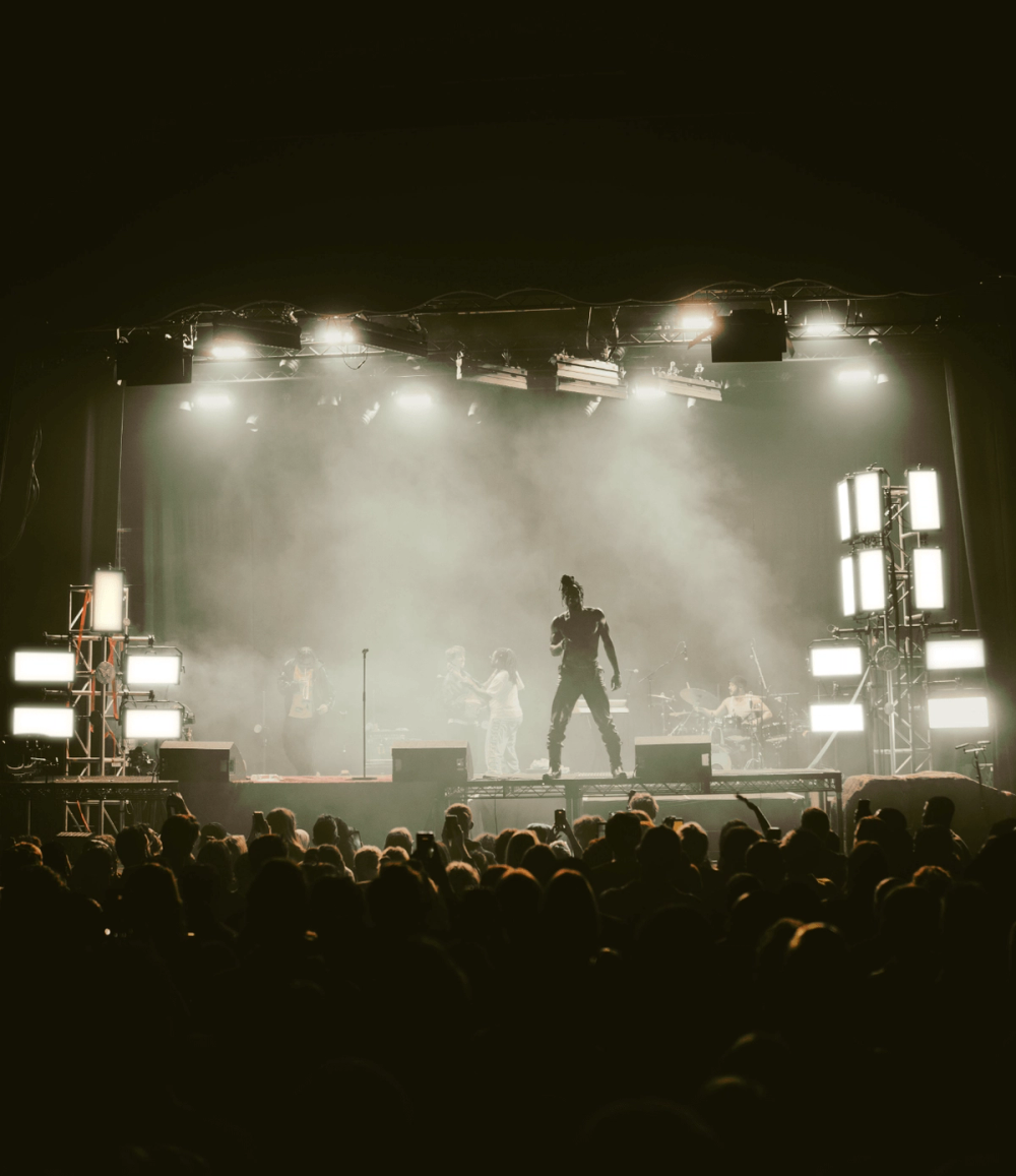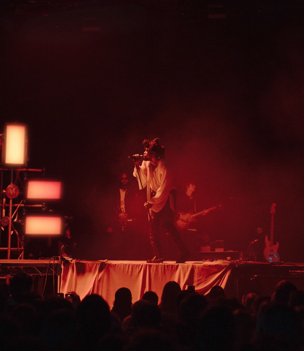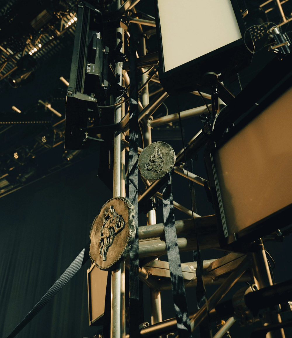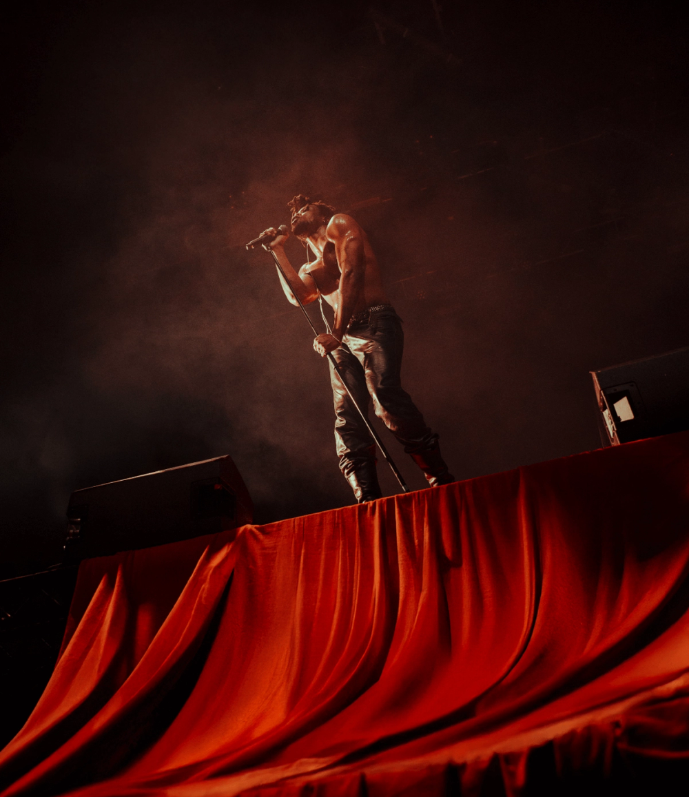 Visually manifesting this idea of duality we created a stage divided in two by a stage high sheet of light. On one side, a soft velvet drape cascades over the edge of the stage towards the audience. On the other, industrial steel decking is finished with a large hard edged rock. This provides two zones to perform within, hosting the different sides of Obongjayar's personality and performance. And as an audience member, it's impossible to take your eyes off the dynamic progression of Obongjayar’s performance on stage, so we created a long elevated catwalk across the whole stage to elevate the performance and bring him closer to all the crowd throughout the floor and galleries.