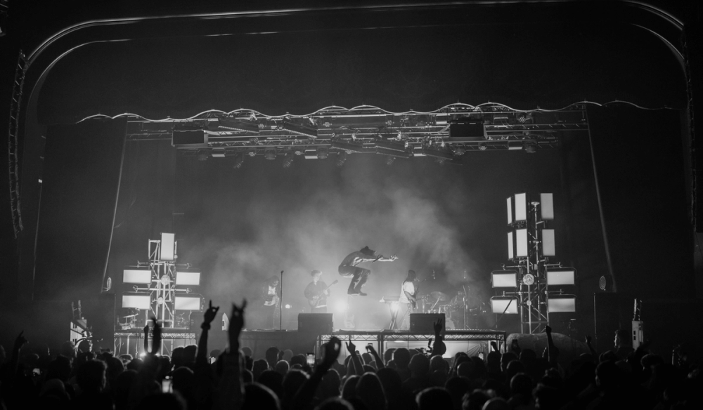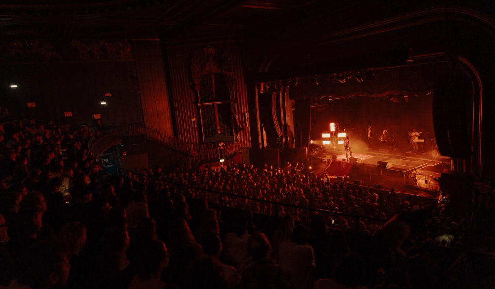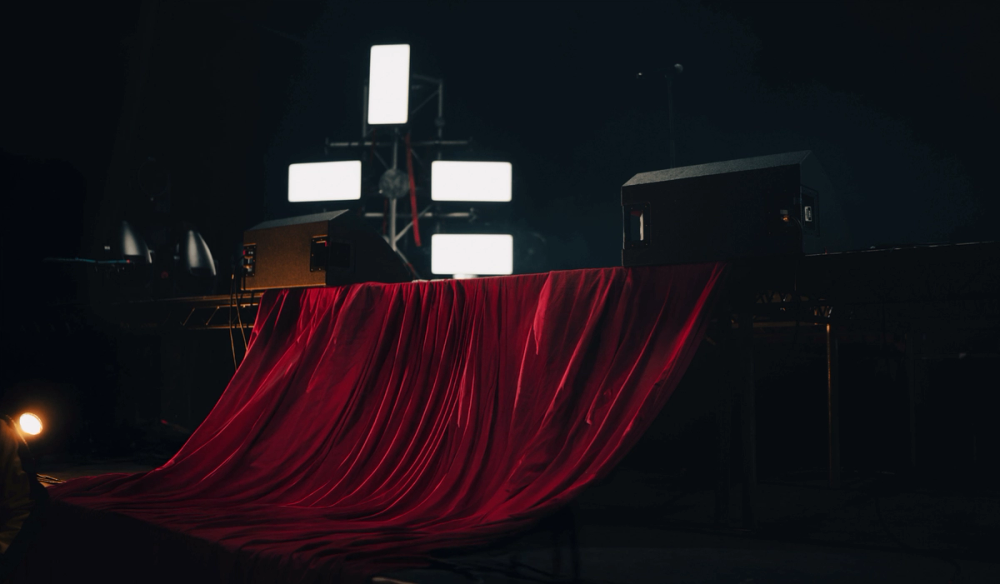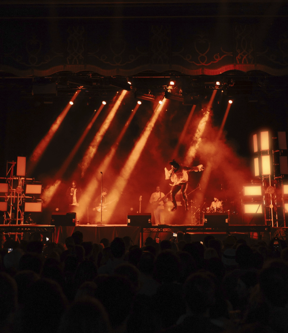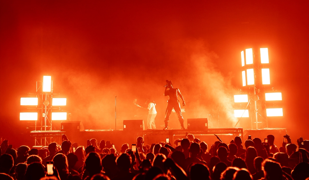 Visually manifesting this idea of duality we created a stage divided in two by a stage high sheet of light. On one side, a soft velvet drape cascades over the edge of the stage towards the audience. On the other, industrial steel decking is finished with a large hard edged rock. This provides two zones to perform within, hosting the different sides of Obongjayar's personality and performance. And as an audience member, it's impossible to take your eyes off the dynamic progression of Obongjayar’s performance on stage, so we created a long elevated catwalk across the whole stage to elevate the performance and bring him closer to all the crowd throughout the floor and galleries.
