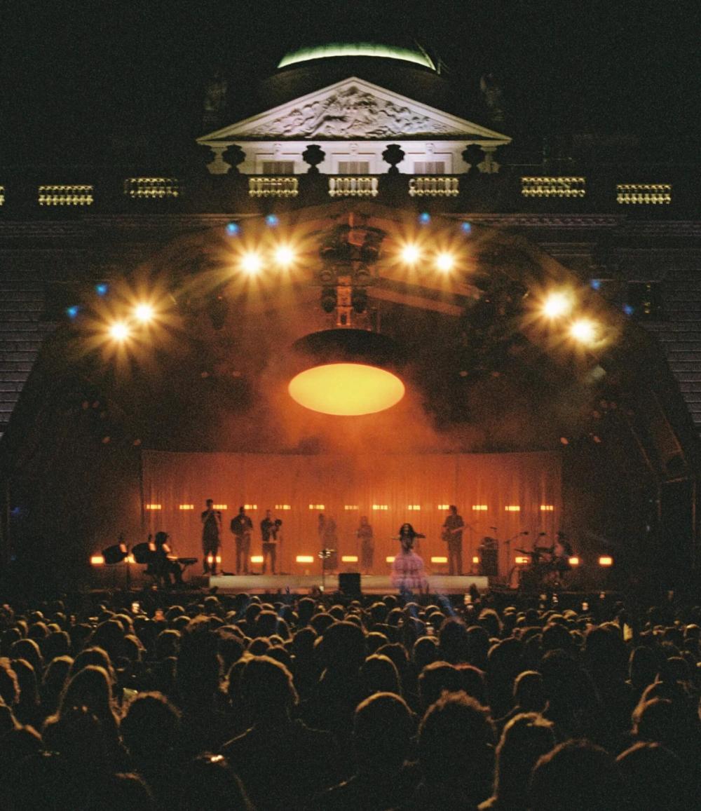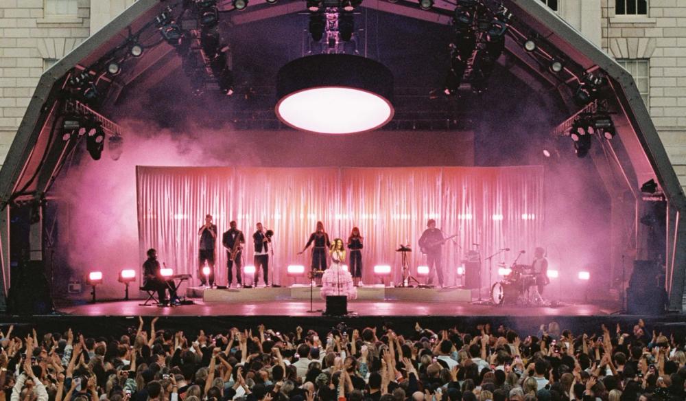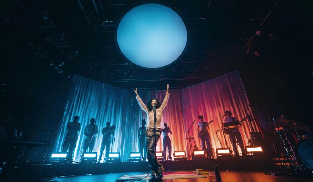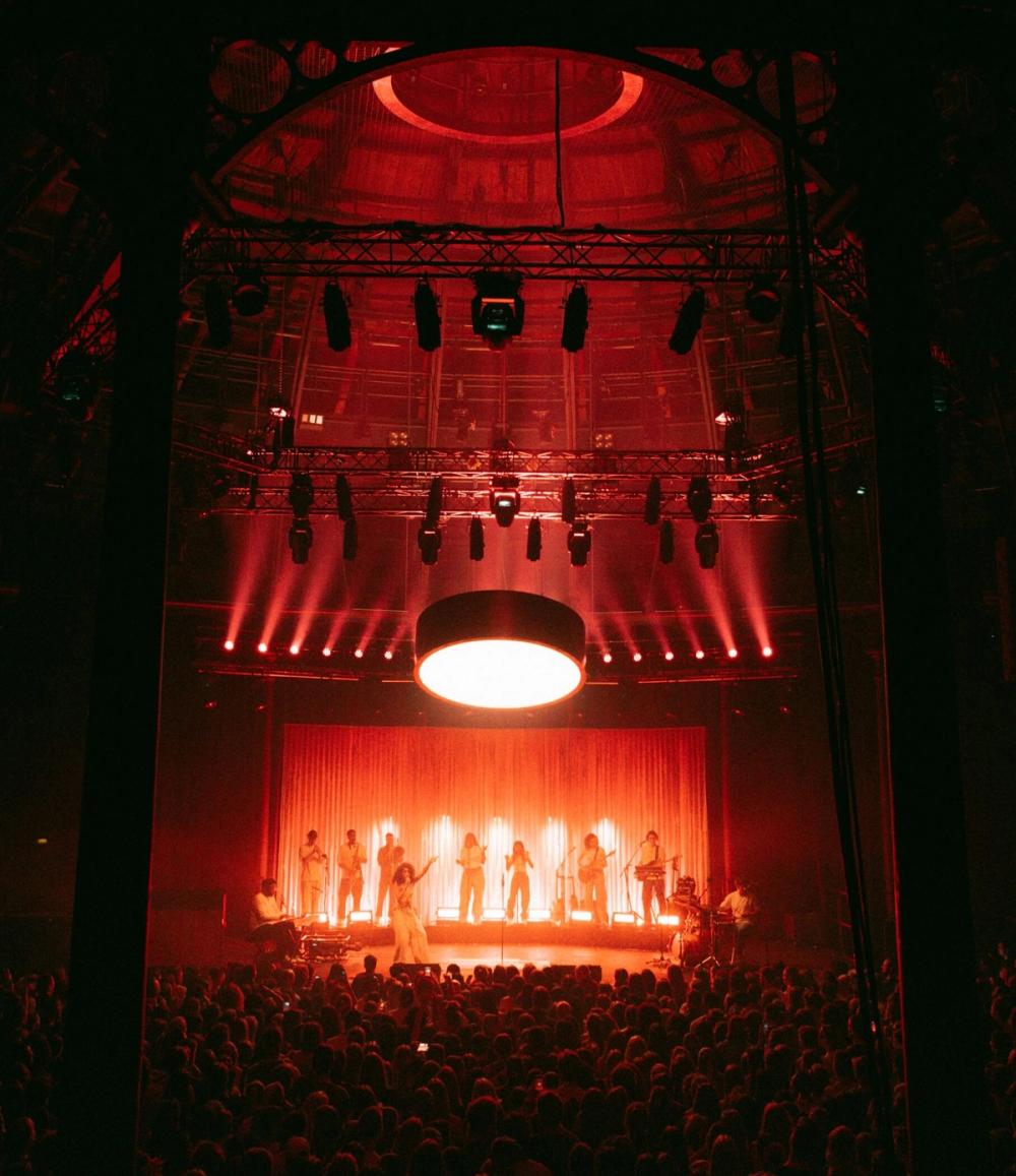 Olivia Dean has many sides. She is confident, adventurous, playful, curious, chaotic, anxious, insular and a perfectionist. She beams bright yellow sunshine when she enters a room, envelops you in a warm red glow of love, cries a deep blue sadness and follows with a glittering sparkle of laughter. "Messy" is a collection of all these things and a study of what and who makes her feel. The spatial concept for Olivia Dean’s EU tour was based on the idea of refraction, plotting the stage based on the lines of light and colour from prismatic refraction. Olivia is conceptually the equivalent of the prism - the epicentre of the stage from which all light, colour and energy flows. This design landed as a set of sheer drapes composed of thin strips of fabric that each have a subtle colour, which when overlaid form blended colours as they intersect.